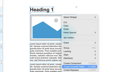 You can add a dynamic panel by dragging one from the Libraries pane or by drawing one using the option in the Main Menu (shortcut “D”). Alternatively, you can right-click a widget (or multiple selected widgets) on the canvas and select Create Dynamic Panel from the context menu.