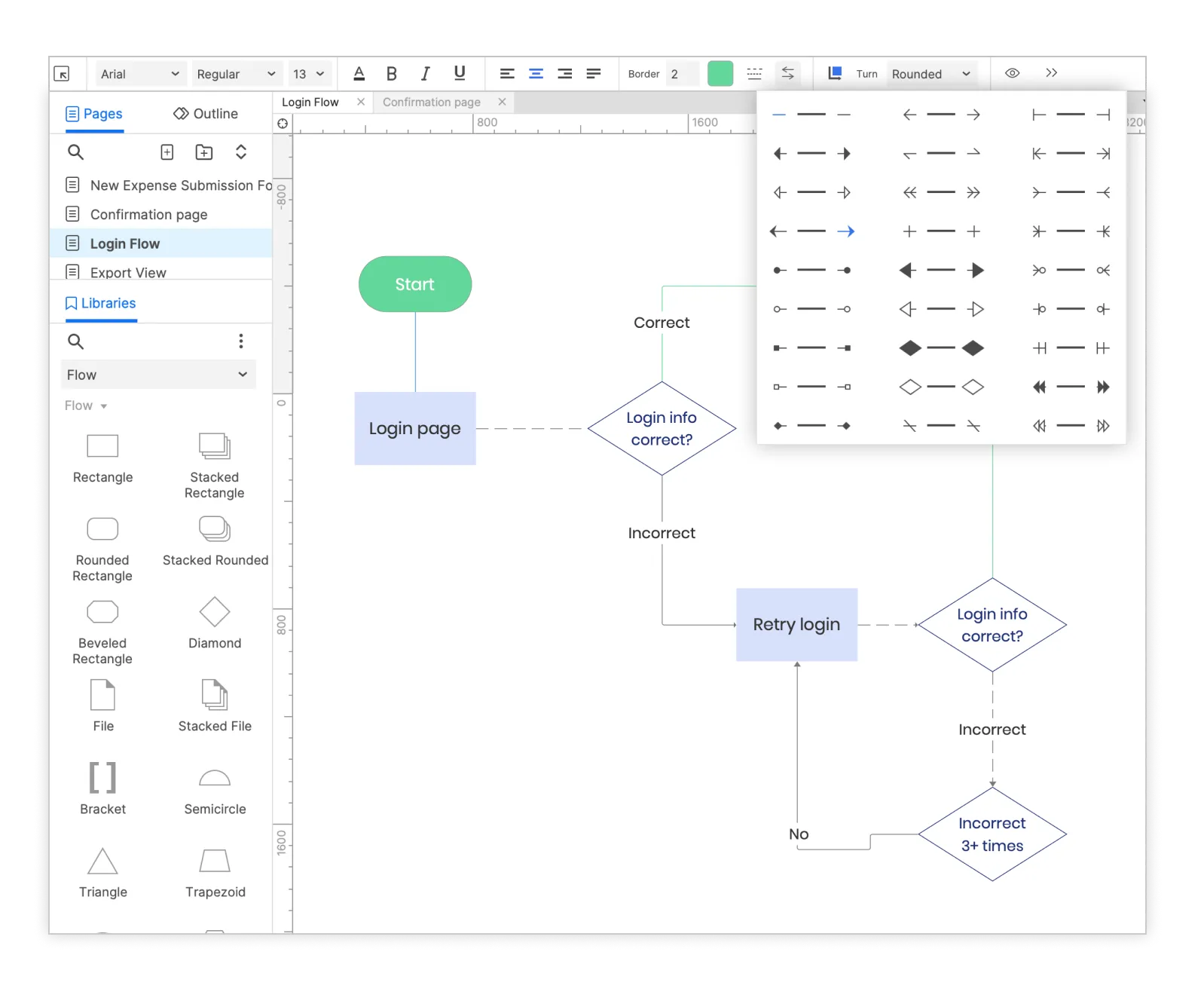 When you want to show the flow through your wireframes, create flow diagrams in Axure RP using connectors that autoreflow and many options for arrow and connector styles.