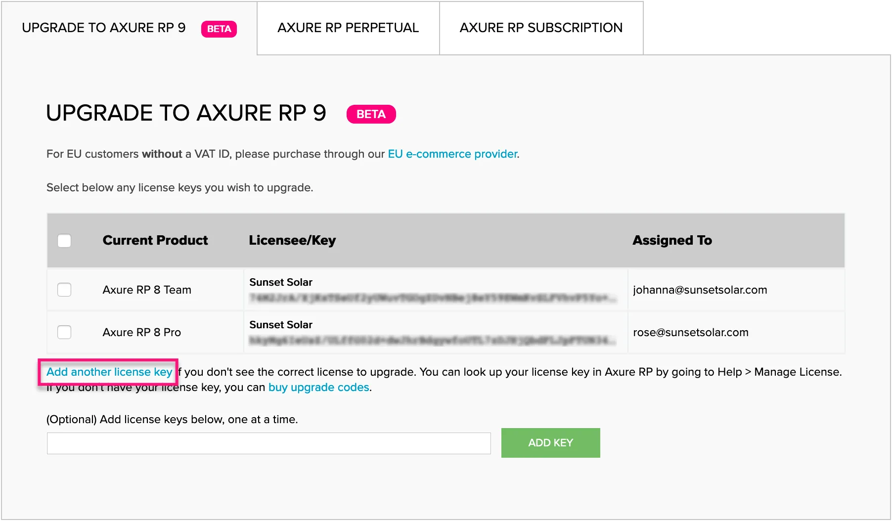 - If you're logged in to the customer portal, check the licenses you want to upgrade. To upgrade one that's not listed, click Add another license key and enter key in the field that appears.