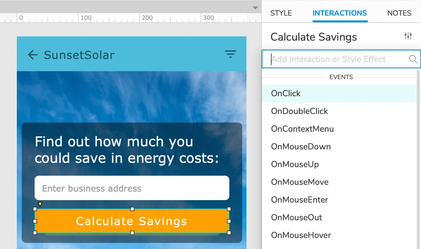 The new Interactions pane includes an interface for building interactions right in the pane itself. To get started, select a widget and click New Interaction or one of the widget-specific Common Interactions shortcuts.
