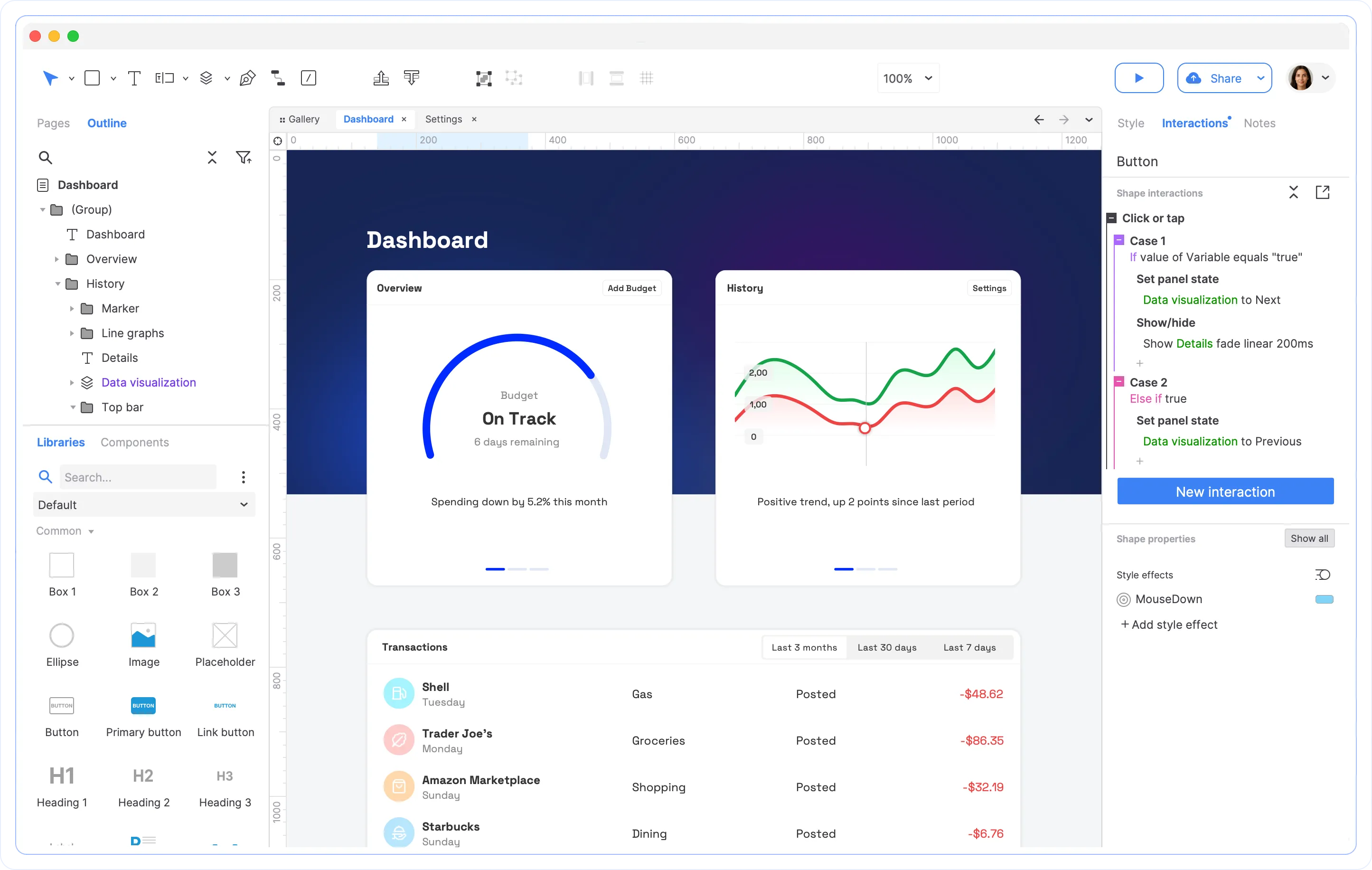 Create UX prototypes with unlimited combinations of event triggers, conditions, and actions to truly explore digital experiences.