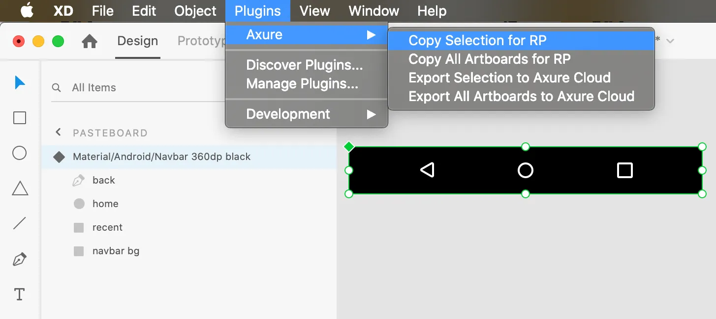 - In XD, select the elements you want to copy and go to Plugins → Axure → Copy Selection for RP. (You can also copy all assets with the Copy All Artboards for RP option.)