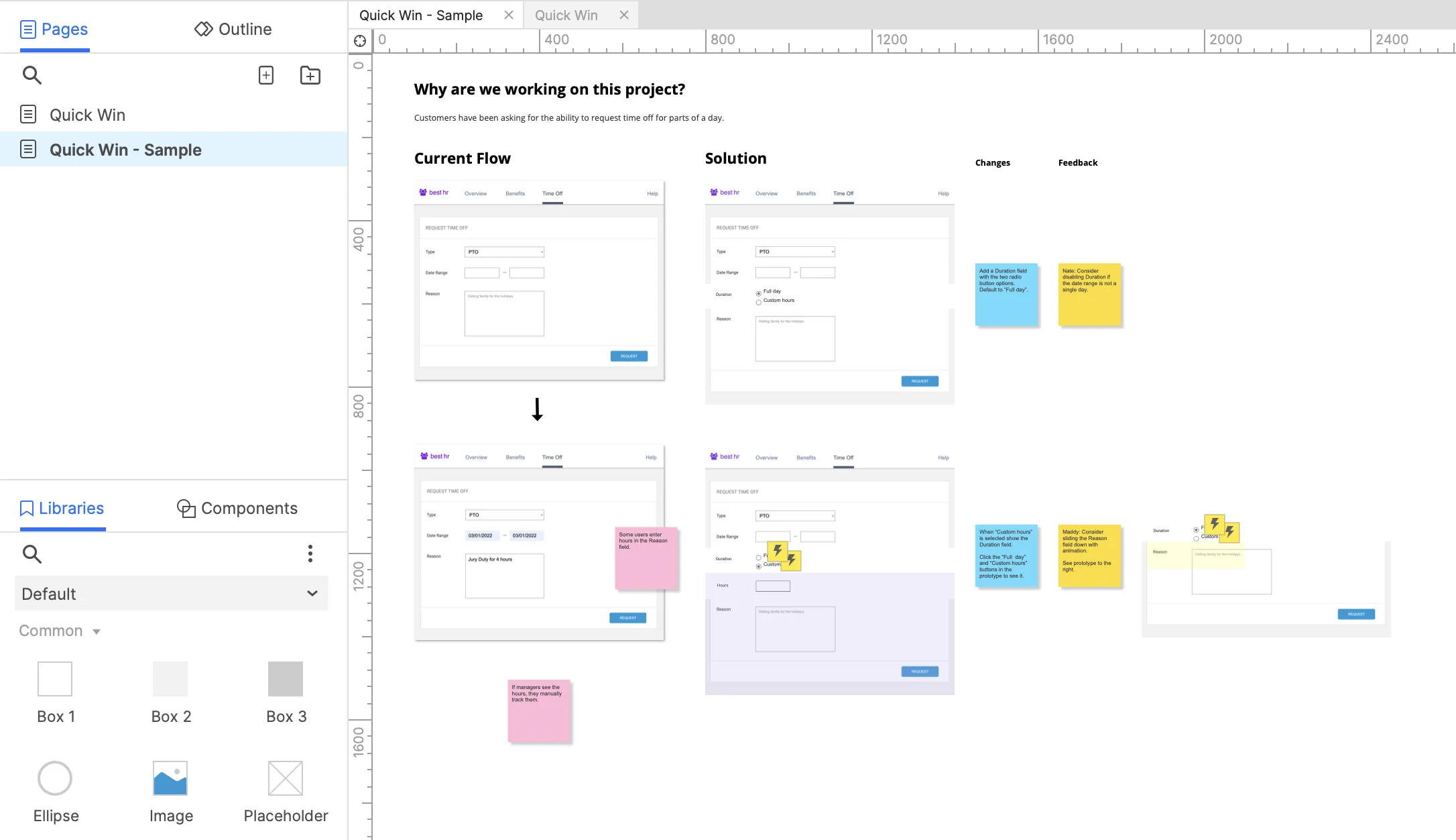 The Quick Win template also comes with sticky notes on the canvas so that you can easily document what the changes are and note down any feedback you receive, making handoff to your development team clear and simple.
