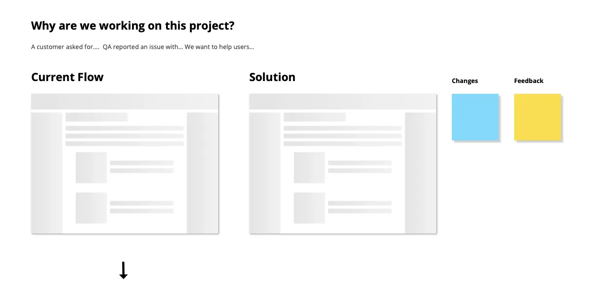 With the Quick Win template, making updates to a current design or prototype is a breeze. In the template, you'll see a sample which demonstrates how you can quickly show your existing design's current flow and your proposed new solution so that they can be viewed together, side by side.