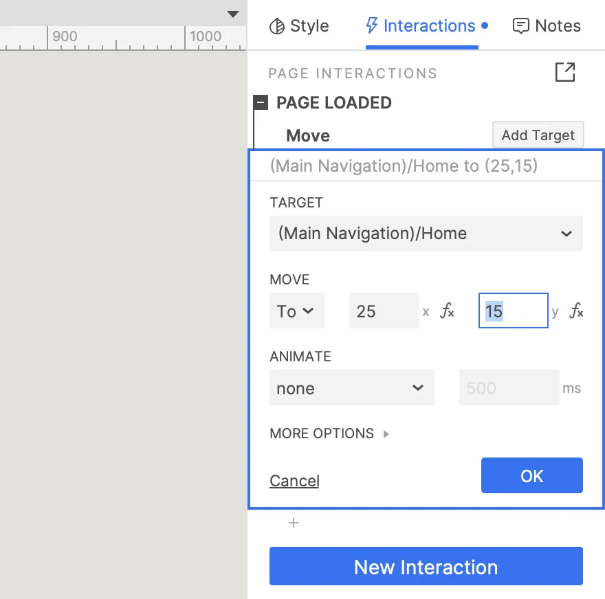 If you are working with a multi-layered design and are having trouble editing buried widgets, try spacing them out on the canvas while editing, rather than having them layered on top of one another. Then, rather than moving them back and forth throughout the editing process, you can set up a Page Loaded interaction with a "Move" action to relocate them to the required location when the prototype is viewed. A great example of this is building a mobile prototype with a menu that expands from the top left. Rather than attempting to edit this menu while located on top of the rest of the design, you can instead edit it in an open space on the canvas and set up a Page Loaded > Move interaction targeting the widgets you need to relocate.