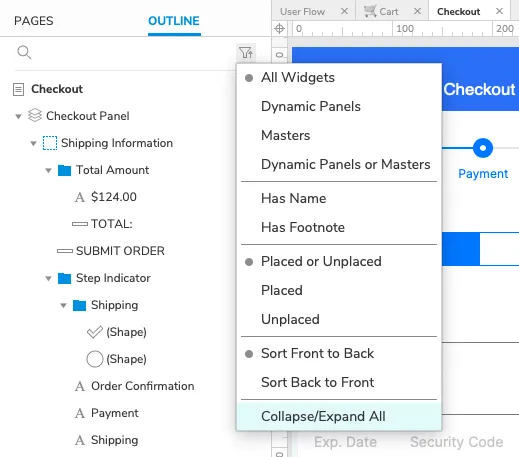 If you ever want to temporarily hide widgets on the canvas, you can use the Hide from View button in the Outline pane. This button will appear for Groups, Dynamic Panels, or Components and will hide them from your view on the canvas while editing, but they will still appear in the prototype.