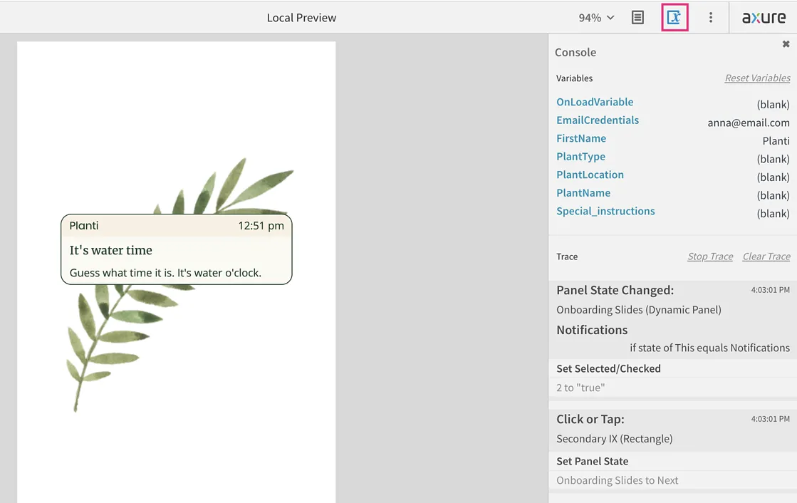 If you ever need to see a list of your prototype interactions, whether for documentation or troubleshooting purposes, you can do so when previewing your prototype. Start by opening the console panel, selecting Start Trace, and then triggering interactions and associated events as you interact with your prototype. This allows you to isolate interactions in any problem areas and make adjustments as needed.
