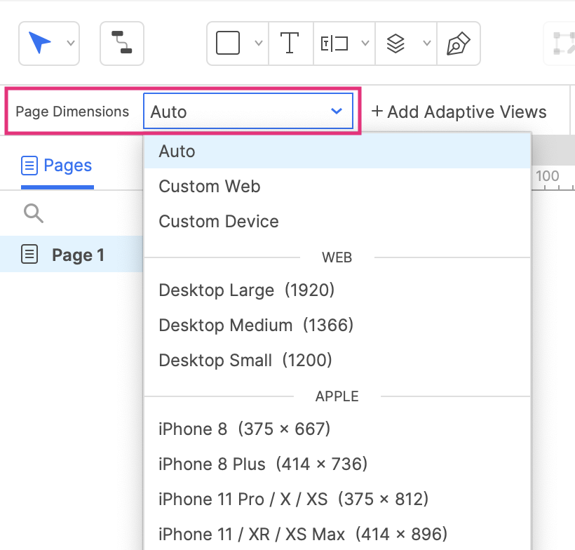 In the Style Toolbar or Style Pane, you can style your pages, such as changing the background color or page alignment. You can also change the page size to match the device or viewport you’re designing for.