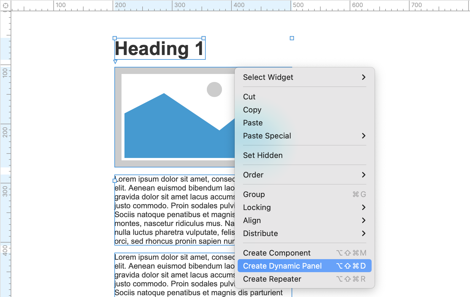 You can add a dynamic panel by dragging one from the Libraries pane or by drawing one using the option in the Main Menu (shortcut “D”). Alternatively, you can right-click a widget (or multiple selected widgets) on the canvas and select Create Dynamic Panel from the context menu.